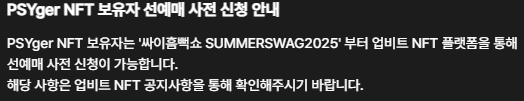 2025년부터 PSYger NFT 선예매 방식이 기존 soPSYety → 업비트 NFT 메뉴로 변경되었습니다. 기존 회원도 변경된 절차를 따라야 선예매가 가능합니다.